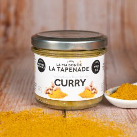 Olives Vertes 70 %, huile d’olives, basilic, curry 5 %, câpres, ail, citron.